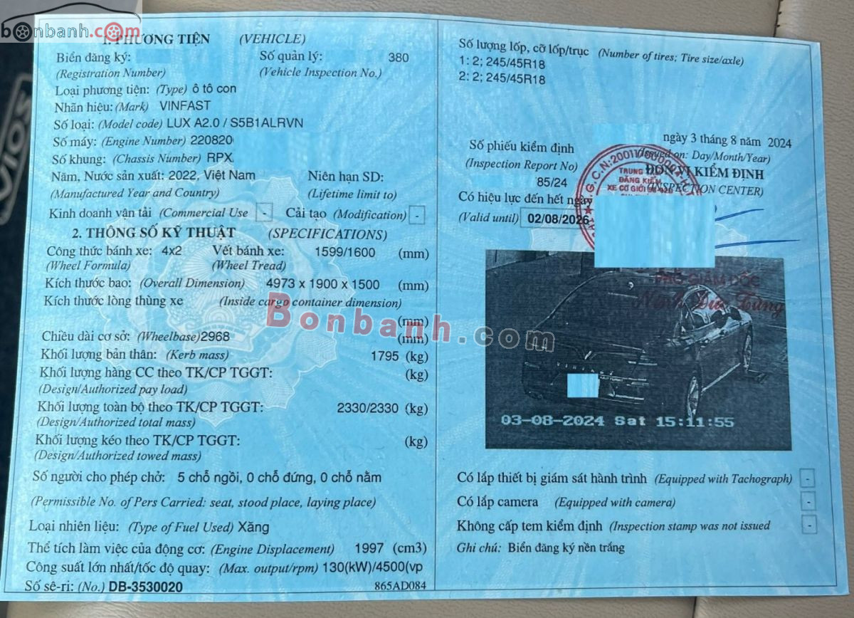 Thông tin chi tiết Xe VinFast Lux A 2.0 Tiêu chuẩn 2022