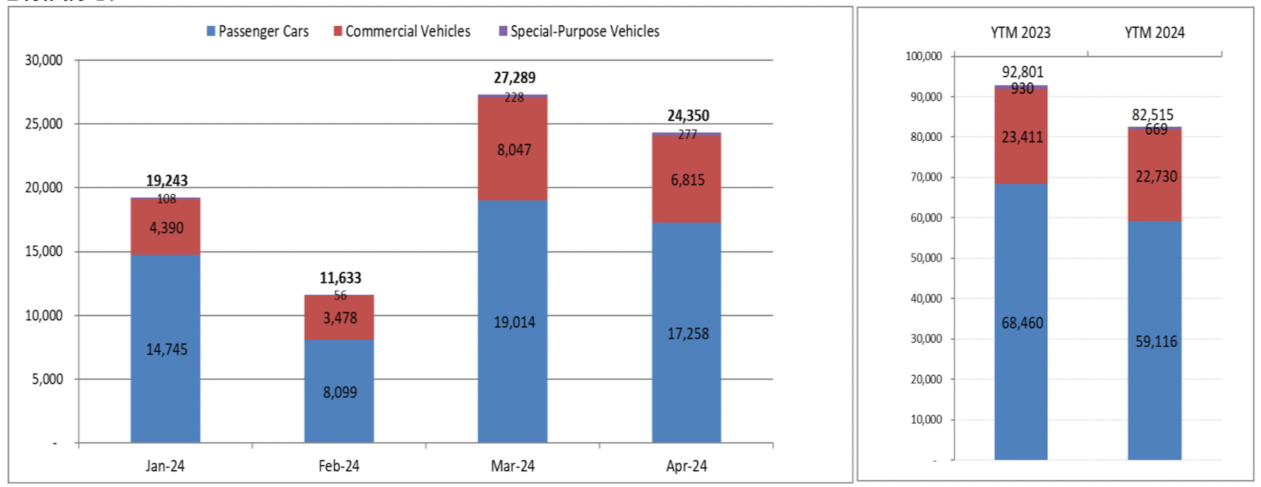 Tính chung 4 tháng của năm 2024, tổng doanh số bán hàng toàn thị trường theo VAMA tổng hợp và TC Motor công bố đạt 96.935 xe (gồm 82.515 xe do VAMA tổng hợp, và 14.420 xe Hyundai do TC Motor công bố riêng). Con số này giảm 13,55% so với cùng kỳ năm 2023.